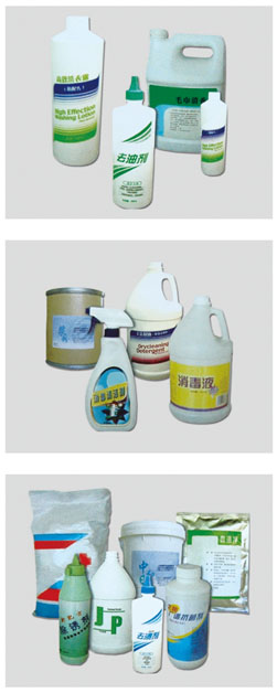 | Universal detergent Strong detergent Whitening strong detergent Concentrated liquid Strong table-doth powder Soft towl powder Color bleaching powder Low-temper bleaching powder color Super Emulsifier Super emulsifier (non-ionic) Detergent for whitening and dust removing Bleaching powder/chlorine bleaching powder Softener (powder) Synthesis strong alkali Dilute acid Soft water agent Acid powder Powder slurry Collar detergent Silky detergent Down Cleaner Rust removing agent Whitening cream for oil decontamination High-efficiency detergent Towel fresh detergent Supper medical detergent Detergent for blood removal Disinfectant Disinfectant (II type) |